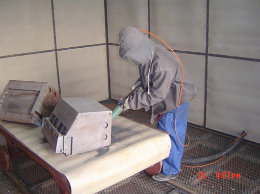噴砂房里面正在操作的工人…